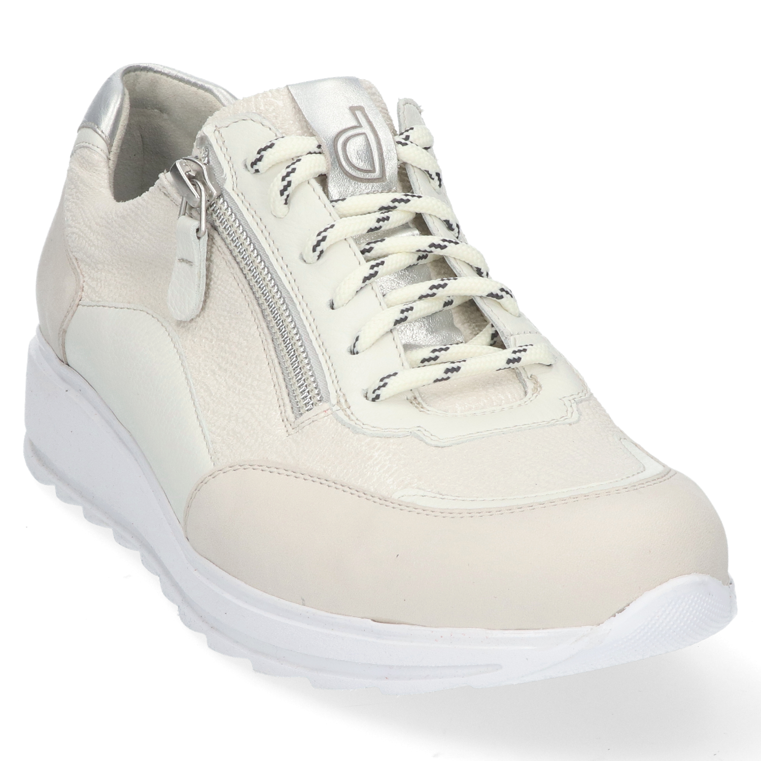 Durea 6263 Sneaker Ivory H. De Durea 6263 Sneaker Ivory H is gemaakt van leer met een leren voering. Het bovenwerk heeft opvallende stiksels, een merkstempel en een rits met leren treklabel. De lichte, flexibele zool zorgt voor ondersteuning, demping en een natuurlijke afwikkeling van de voet. De schoen heeft een uitneembaar voetbed en een rits- vetercombinatie voor het makkelijk aan- en uittrekken. Pasvorm: dit model heeft een wijdte H, hierdoor geschikt voor de normale tot bredere voet.