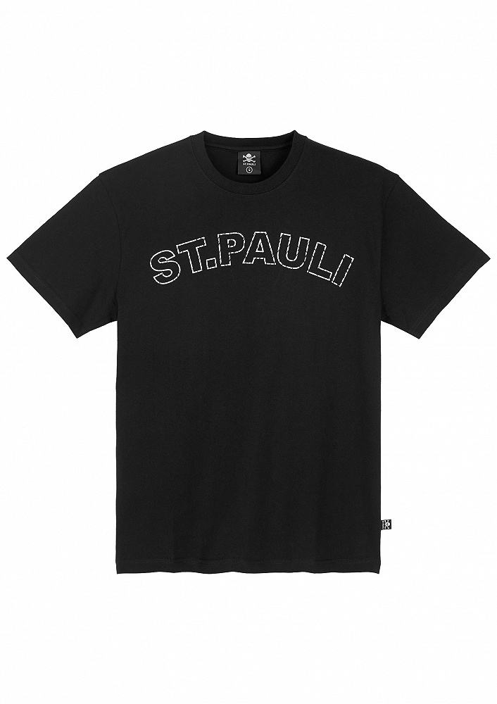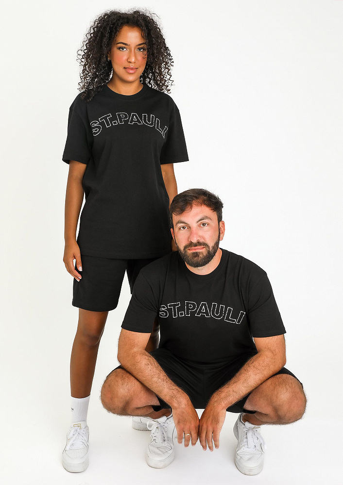 Ruimvallend, zwart T-shirt van zware jersey kwaliteit met grote ST. PAULI-opschrift als print in wit op de borst. Het T-shirt is unisex, gemaakt van 100% biologisch katoen en duurzaam geproduceerd in Portugal.