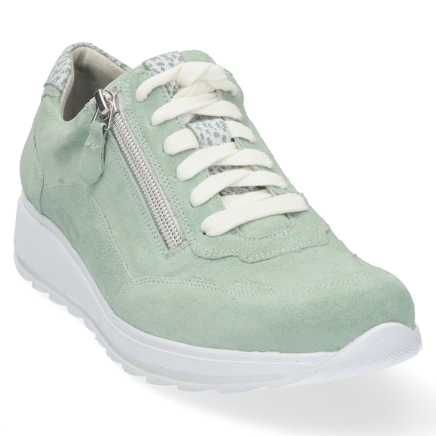 Durea 6263 Sneaker Lichtgroen K. Deze sneaker is de ultieme allrounder dankzij zijn veelzijdige design. Het gestroomlijnde silhouet geeft een perfecte mix van casual en chic. Met opvallende details zoals stikwerk belijningen en een handig ritsje bij de veterrand, maakt deze schoen elke outfit compleet. De speciaal ontwikkelde zool zorgt voor comfort en ondersteuning, ideaal voor elke stap. Pasvorm: Dit model is een K-leest, daardoor geschikt voor de brede voet.