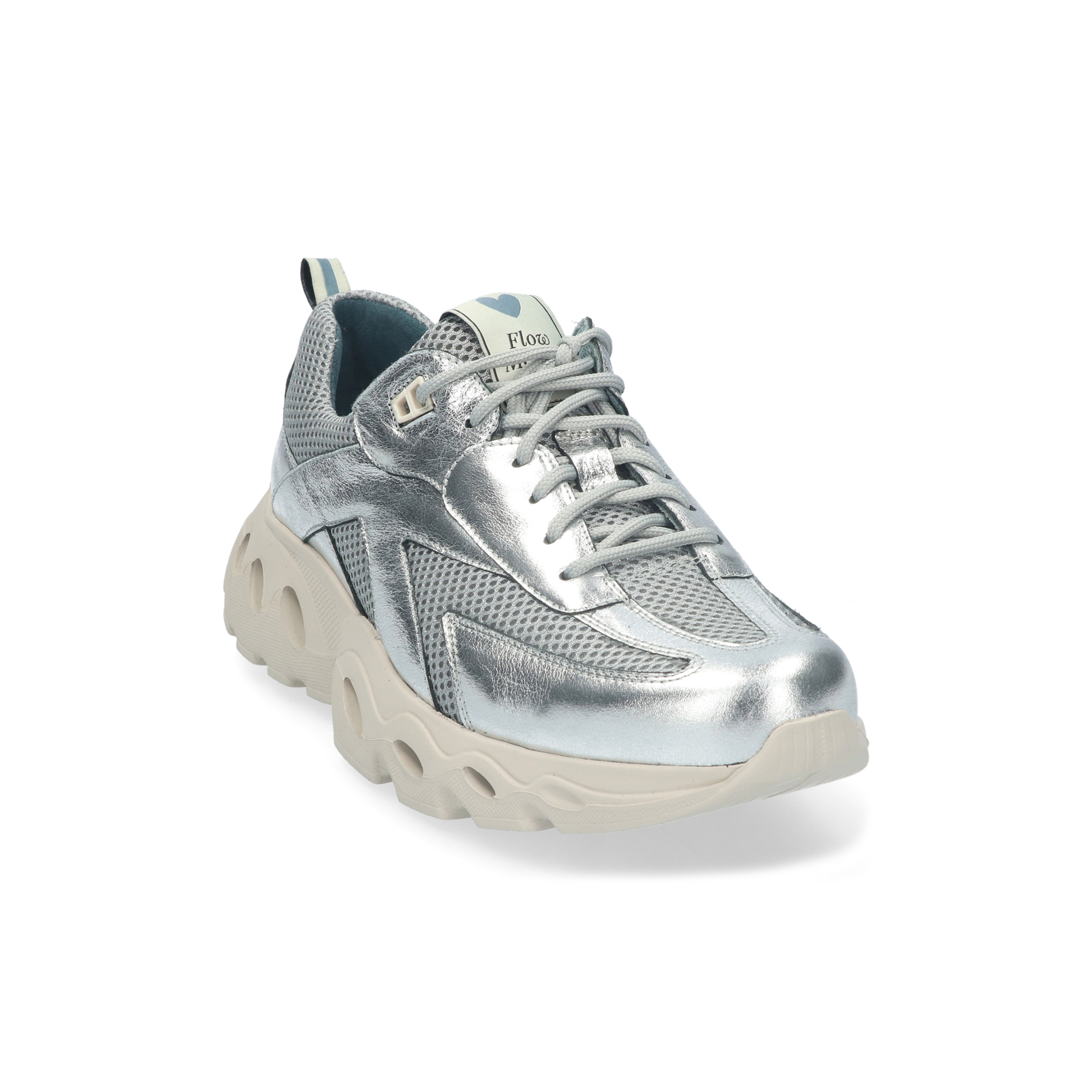 Deze opvallende sneaker combineert een metallic zilverkleurige bovenkant van mesh en leer met een futuristisch, gelaagd design. Dankzij de innovatieve FlowMotion-zool ervaar je een vederlichte, stabiele afwikkeling bij elke stap, terwijl de H-wijdte en het uitneembare voetbed extra comfort en ruimte bieden aan bredere voeten.