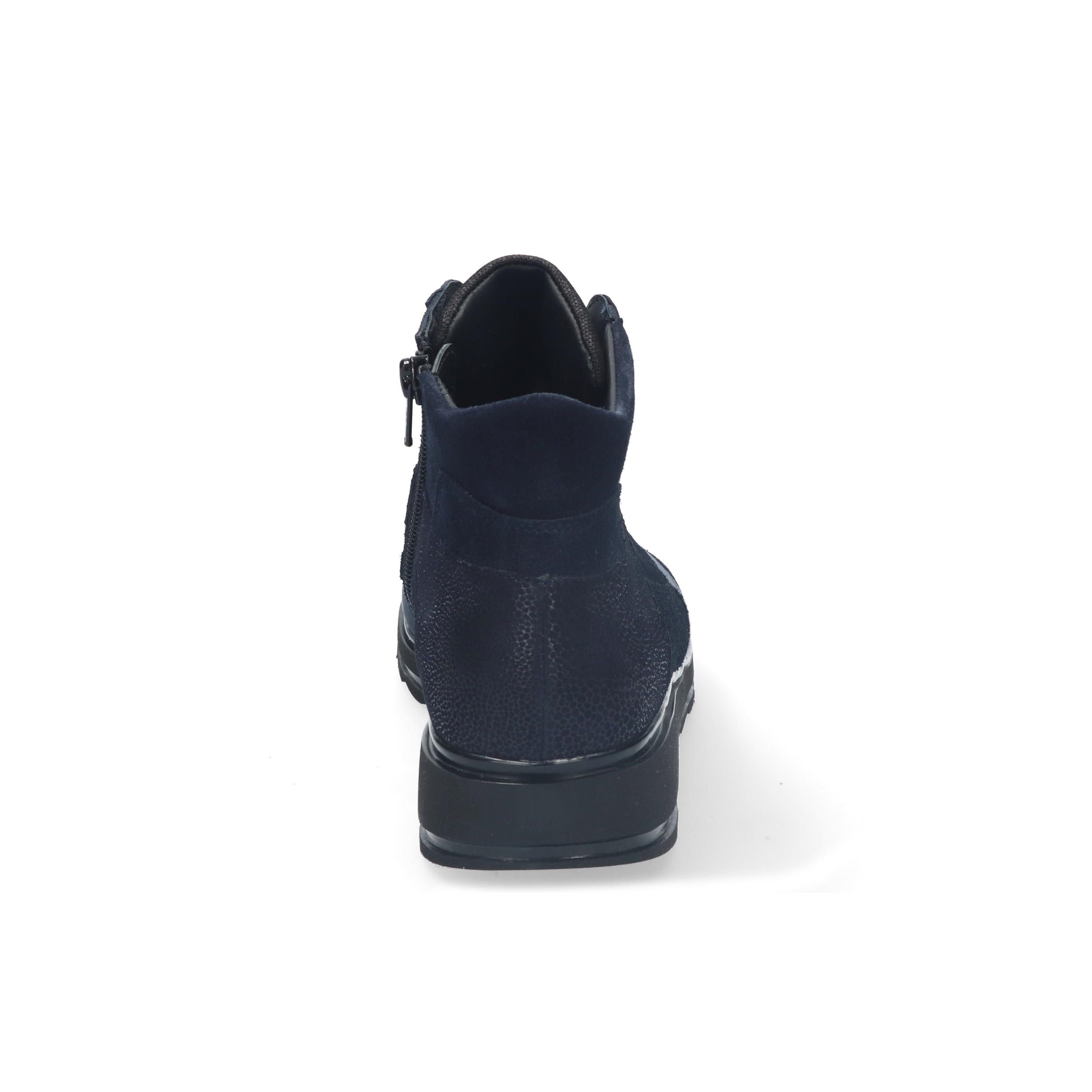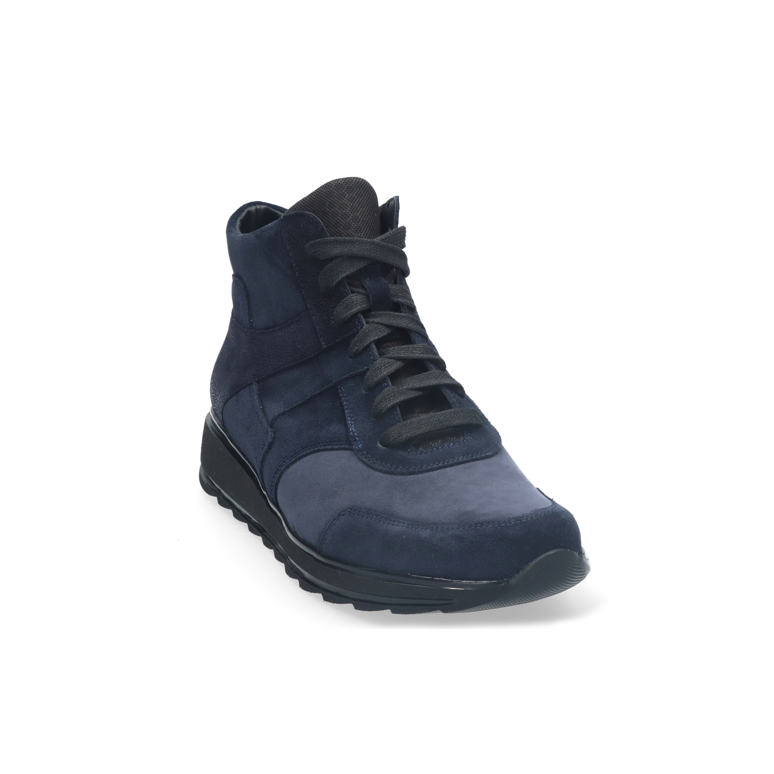 Deze hoge sneaker in marineblauw suède en nubuck straalt een sportieve elegantie uit. De ton-sur-ton kleurencombinatie zorgt voor een rustige, stijlvolle uitstraling. De stevige zwarte zool geeft niet alleen een moderne touch, maar biedt ook uitstekende grip en demping. Dankzij de ritssluiting aan de zijkant trek je de sneaker makkelijk aan en uit. De binnenzijde is gevoerd met leer en het voetbed is uitneembaar, ideaal voor eigen inlegzolen. Een comfortabele keuze voor elke dag.