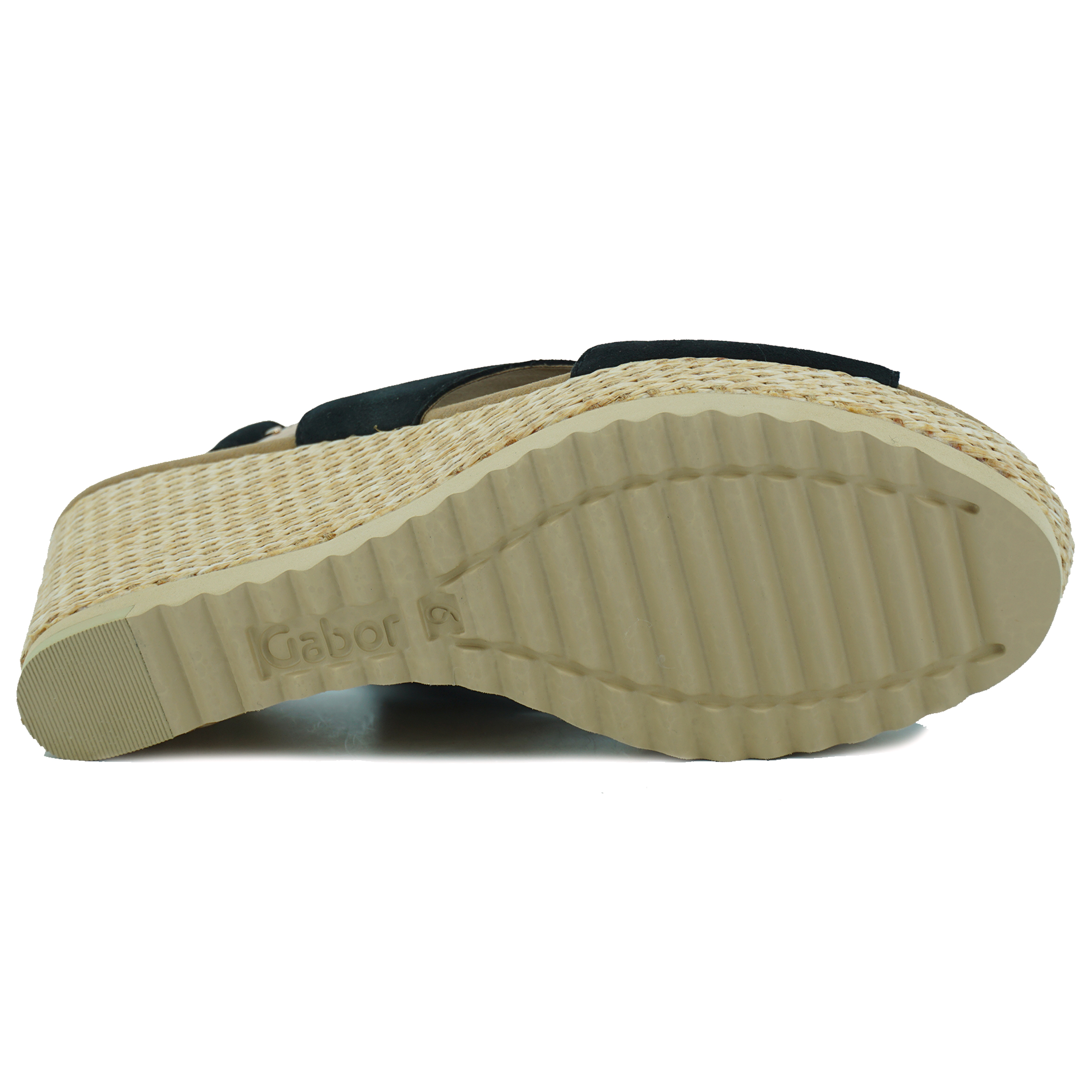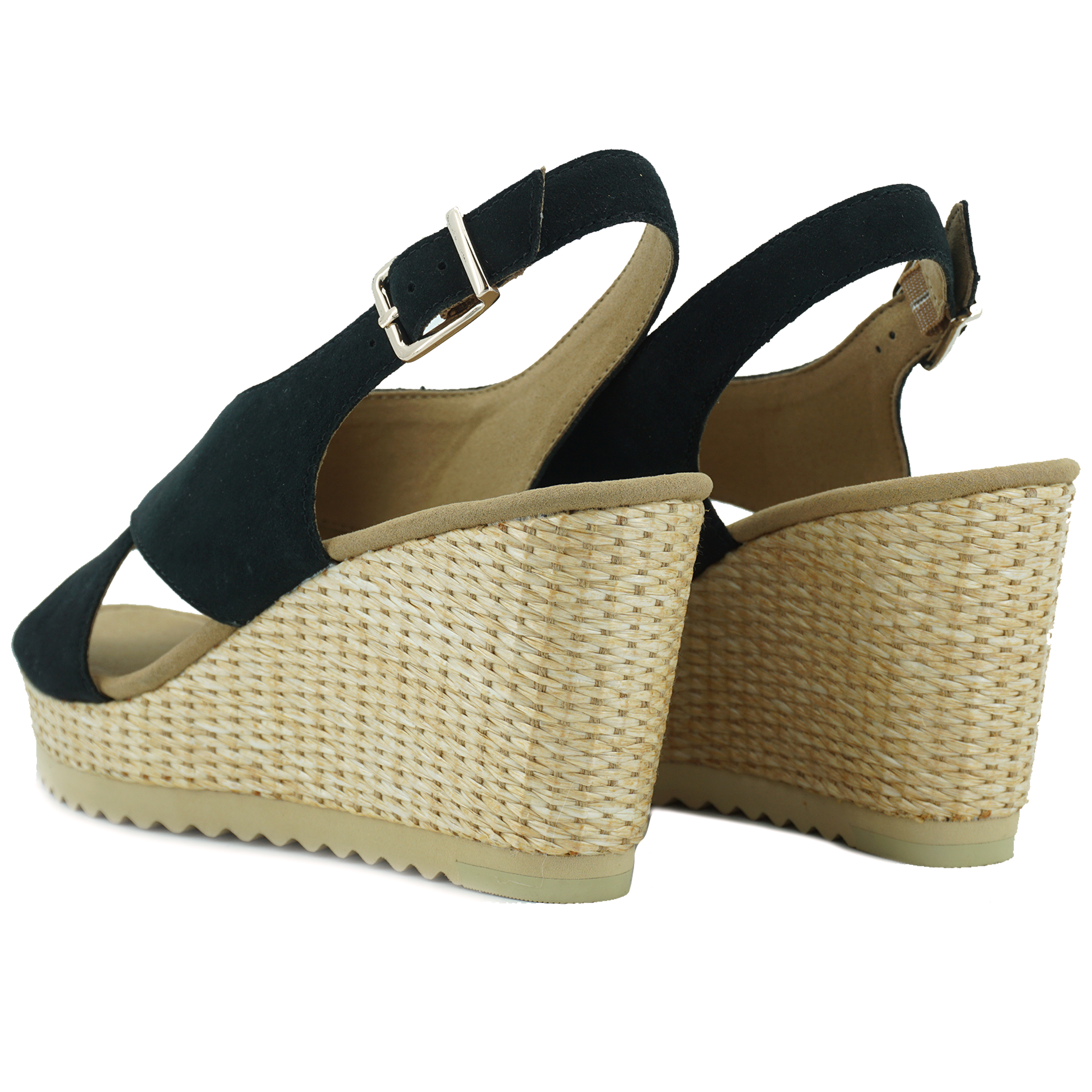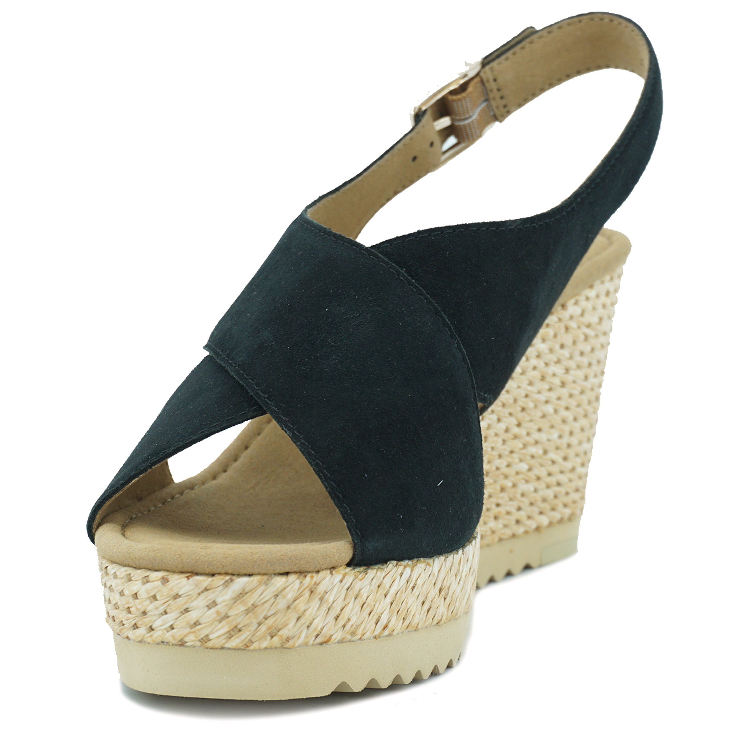 Gabor comfort dames sandaal met hak. Mooie elegante Gabor sandaal in suede in de kleur zwart met een touwlook sleehak.