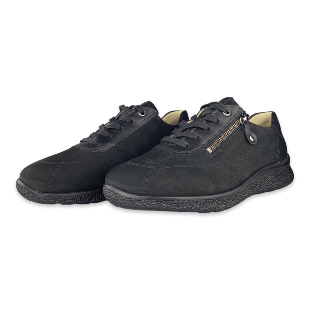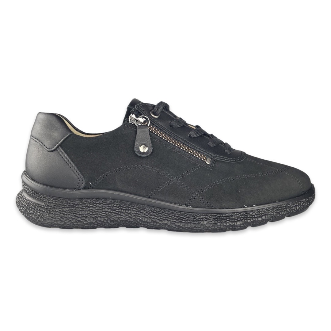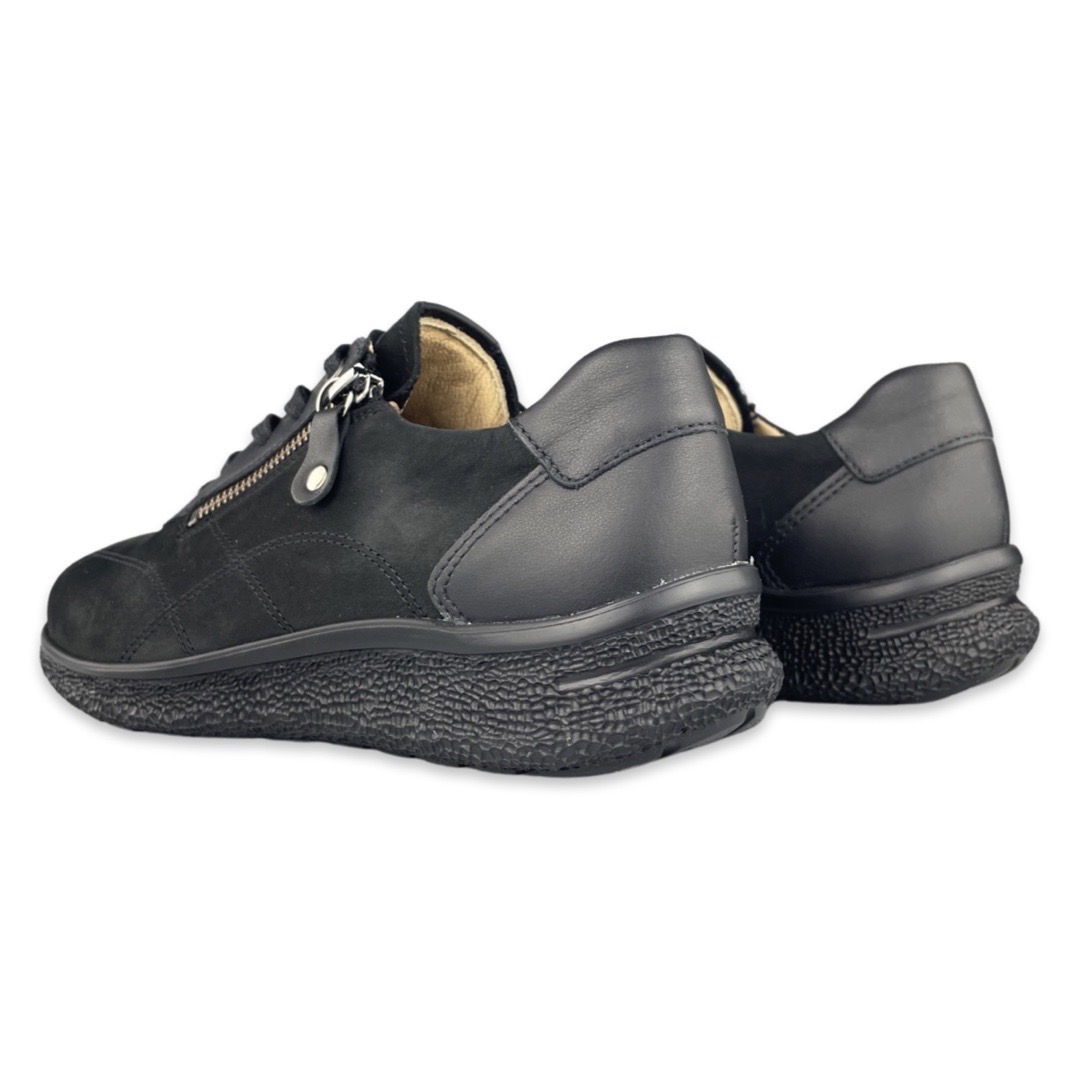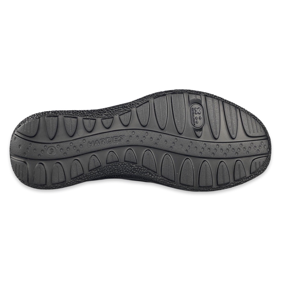 Hartjes 162-1603 Sneaker Rap Black K. Het Oostenrijkse merk Hartjes werd in 1953 opgericht in Oostenrijk en is uitgegroeid tot de grootste schoenenfabrikant van dat land. Het merk stelt zich ten doel om schoenen te ontwikkelen die zorgen voor gezonde voeten. Daarom hebben ze een orthopedische pasvorm. Het voetbed is uitneembaar zodat u ook uw eigen steunzolen kunt gebruiken. Naast het draagcomfort wordt er ook aandacht besteed aan verantwoord ondernemen.Deze zwarte sportieve veterschoenen van Hartjes zitten zeer comfortabel bij langdurig lopen of stilstaan. De damesschoenen zijn van buiten nubuck en de voering is gemaakt van leer. Deze veterschoenen zijn daarnaast voorzien van een uitneembaar voetbed, waardoor ze zijn te combineren met een maatwerk steunzool.Pasvorm: Dit model is een K-leest, daardoor geschikt voor de brede voet.