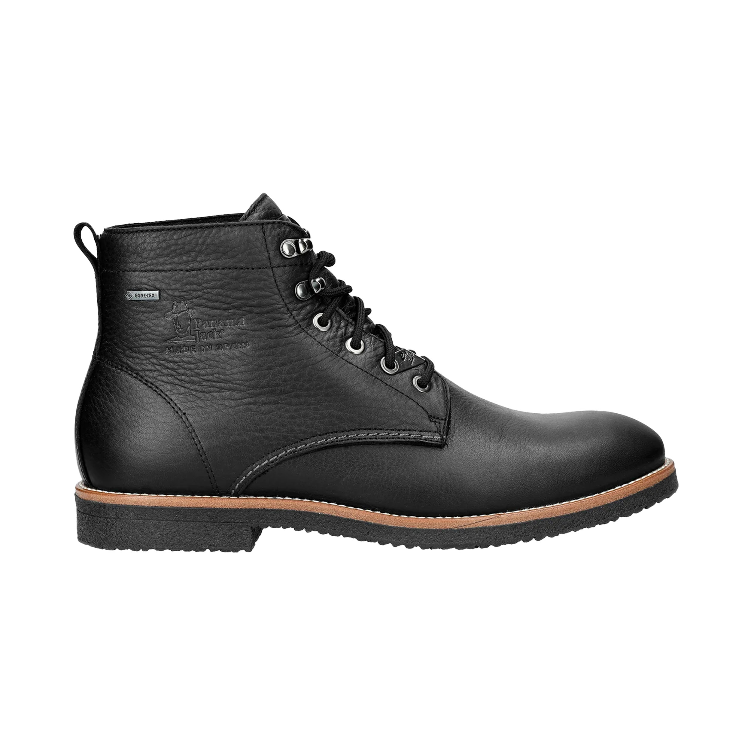 Panama Jack C3 Boot Glasgow GTX Black. Heren enkelboot van waterproof zwart geolied nappa leer met vetersluiting en Gore-Tex voering. Uitneembare anatomische binnenzool en flexibele, duurzame TPU-rubberzool. Schachthoogte: 15 cm, hakhoogte: 2 cm.