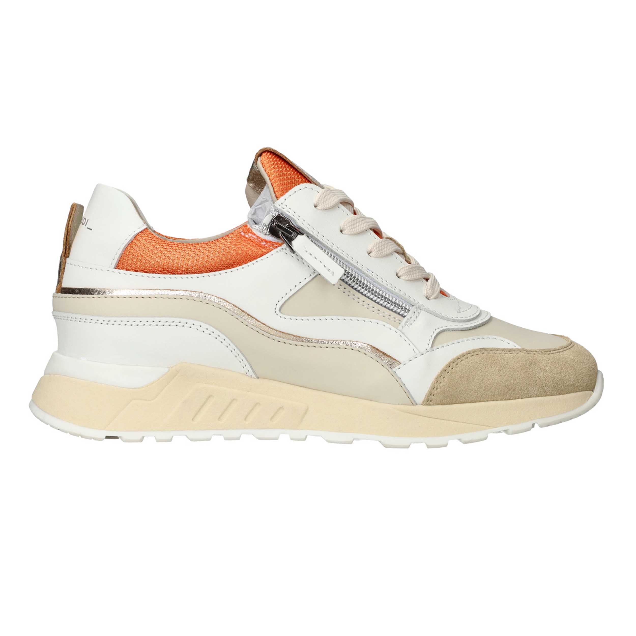 Piedi Nudi 14.06 Sneaker Lore Beige/Orange. De Piedi Nudi 14.06 Sneaker Lore in Beige/Orange is een damessneaker gemaakt van leer en suède. De schoen heeft een uitneembaar voetbed voor eventueel eigen inlegzolen. De beige basiskleur wordt geaccentueerd door oranje details, wat de sneaker een frisse uitstraling geeft.