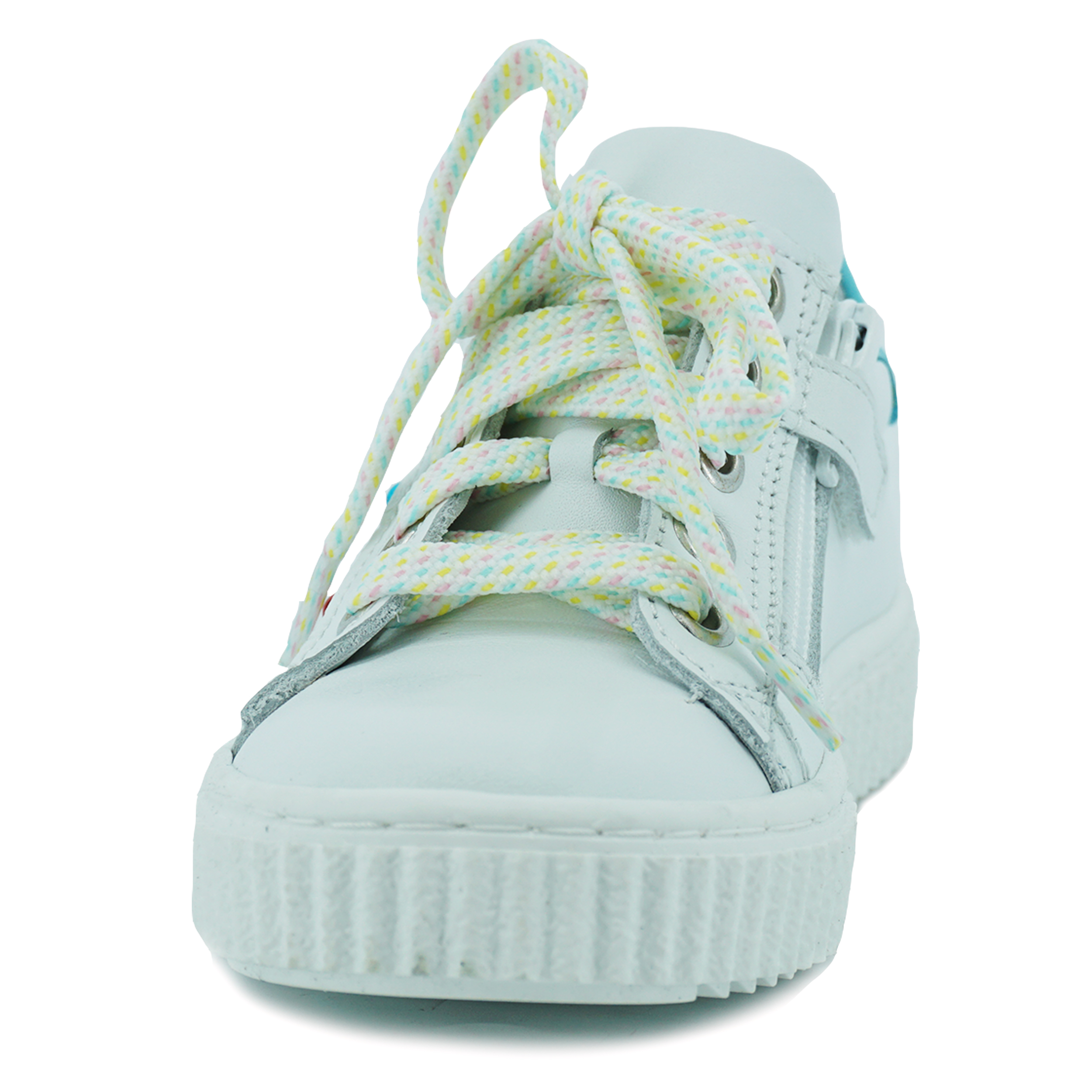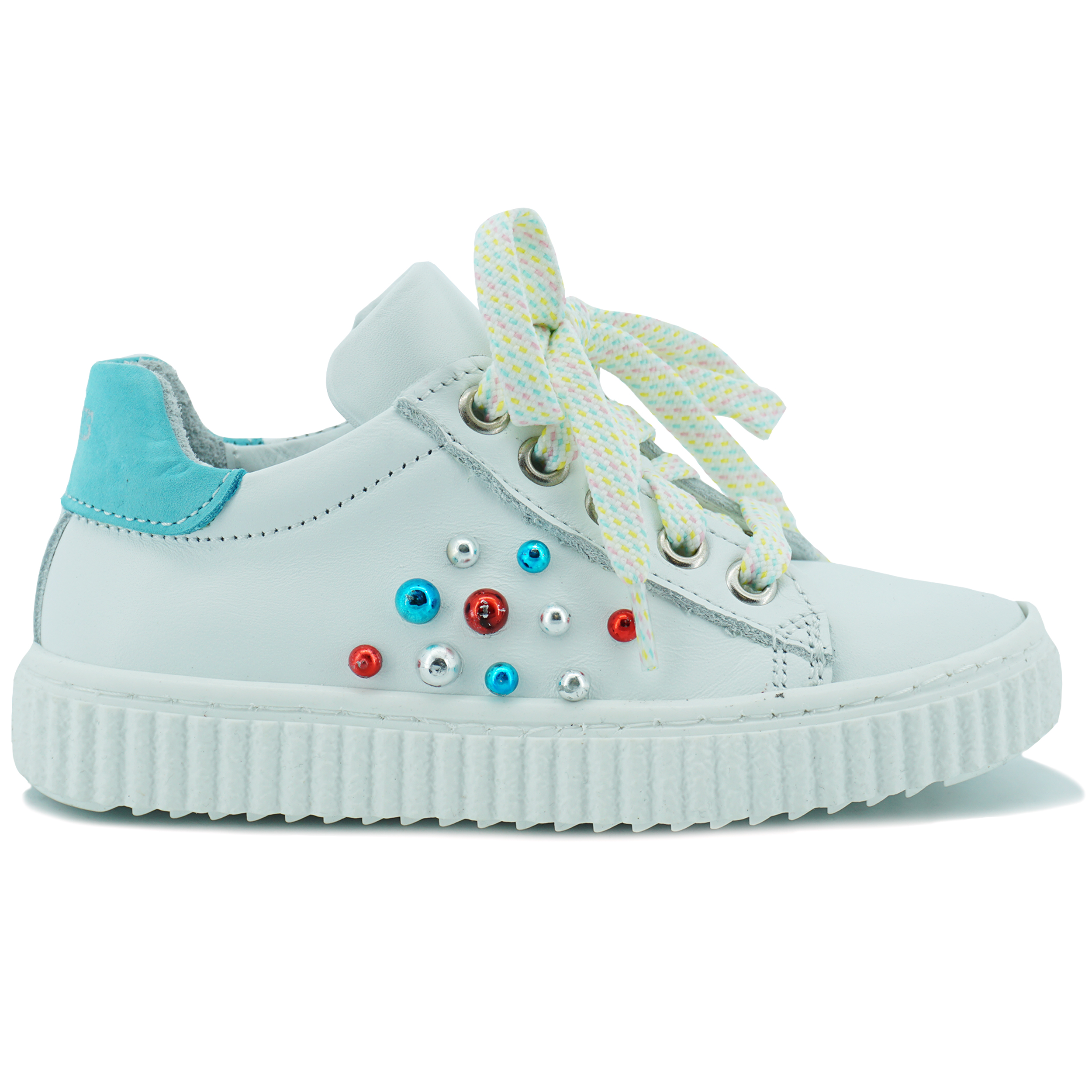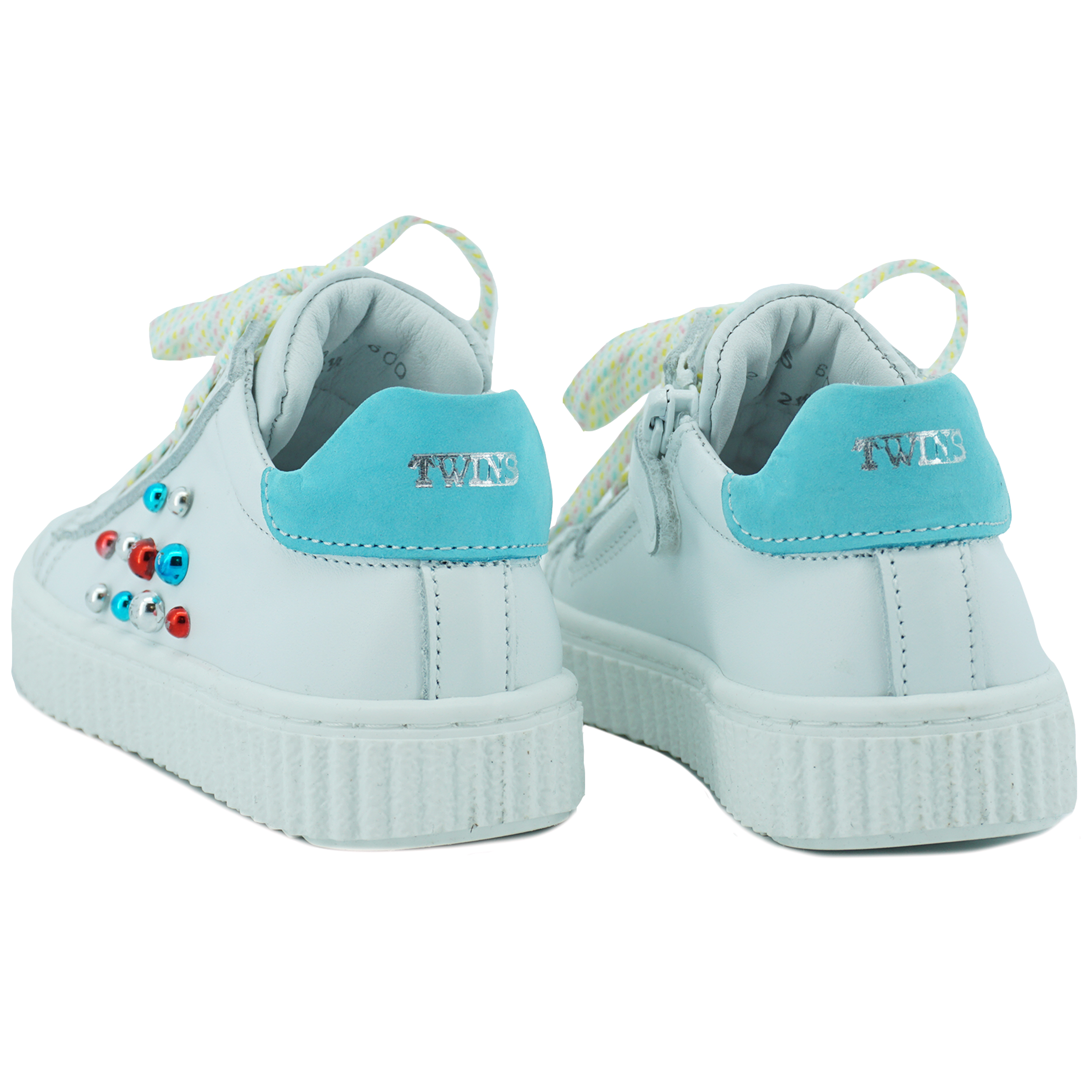 Meisjes sneaker van het merk Twins met verschillende kleurtjes. Aan de zijkant van de schoen zitten rood-zilver-blauwe studs als detail. De veter heeft verschillende kleurtjes en de achterkant van de schoen heeft een blauwe vlak. Door de verschillende kleuren is dit de perfecte sneaker voor de zomer. Naast dat de schoen vrolijk lijkt, is hij ook sportief door de rubberen zool.