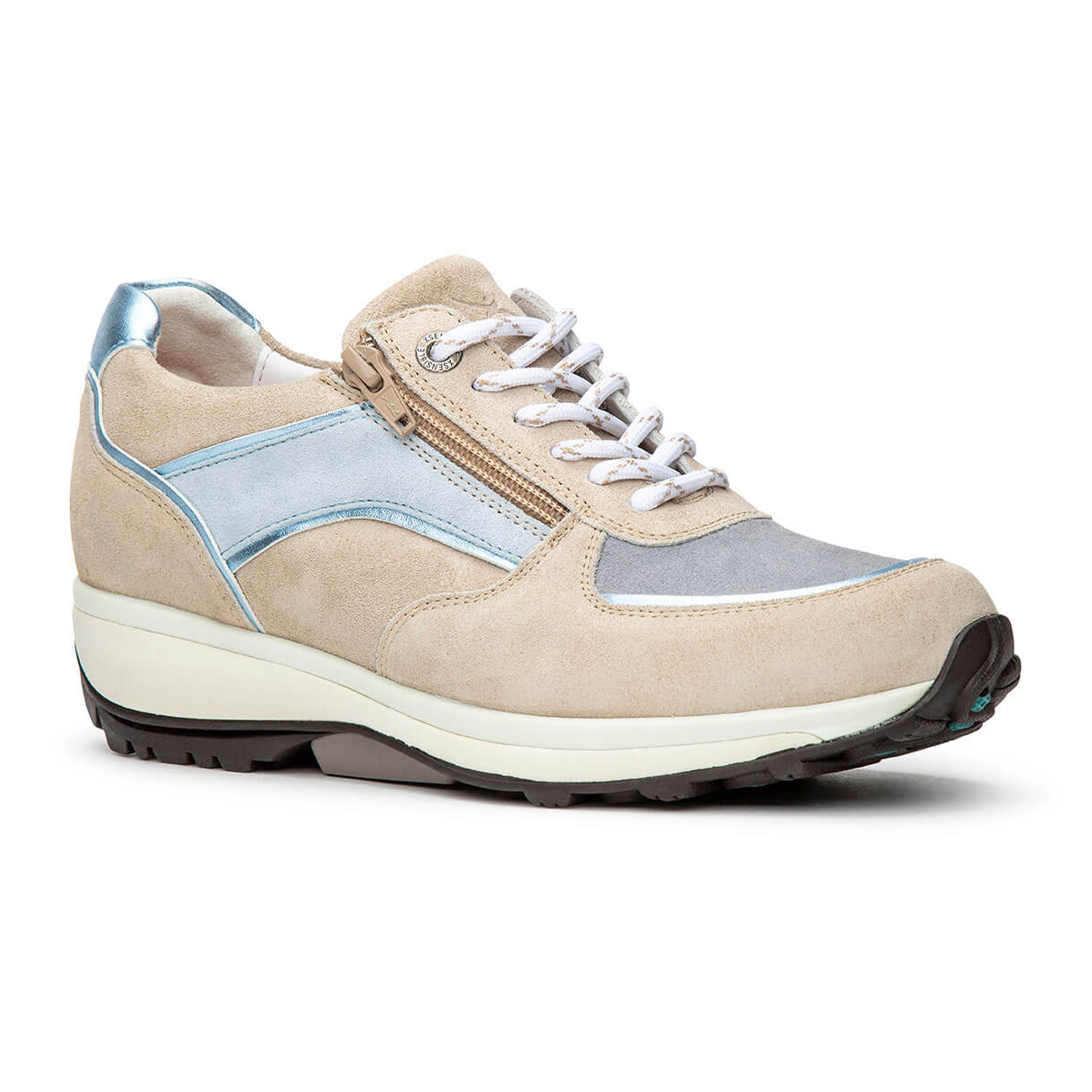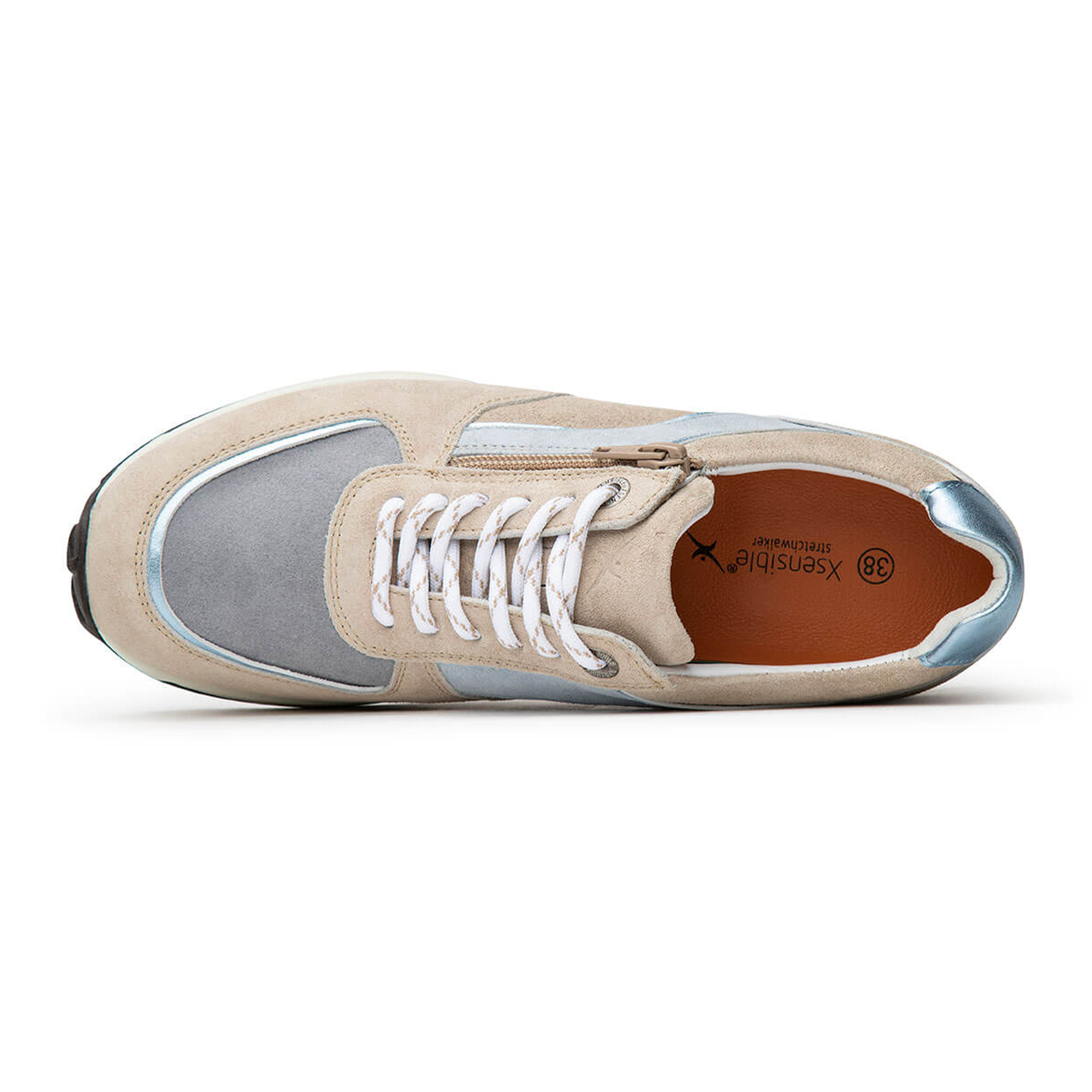 Xsensible Stretchwalker dames sneaker Lucca in het zand en blauw leer. De sneaker heeft een uitneembaar voetbed en erg comfortabel. Leuk te combineren met een jeans of leuke rok.